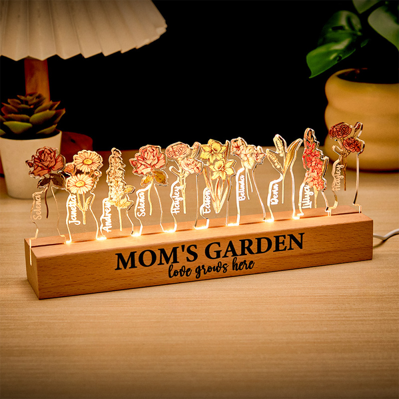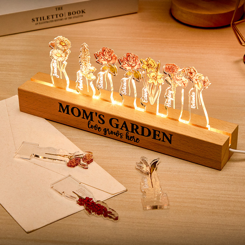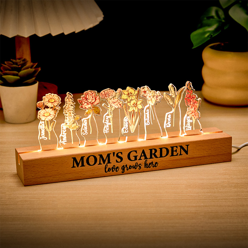 Custom Mom's Garden Love Grows Here Birth Flower Wood Night Light Unique Gifts for Grandma Mother Lamp