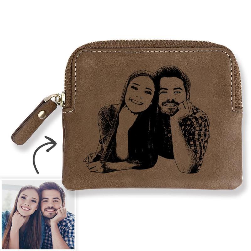 Custom Photo Engraved Zipper Wallet Coin Purse Card Case Brown Leather