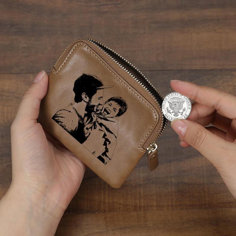 Custom Photo Engraved Zipper Wallet Coin Purse Card Case For Dad - Brown Leather