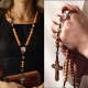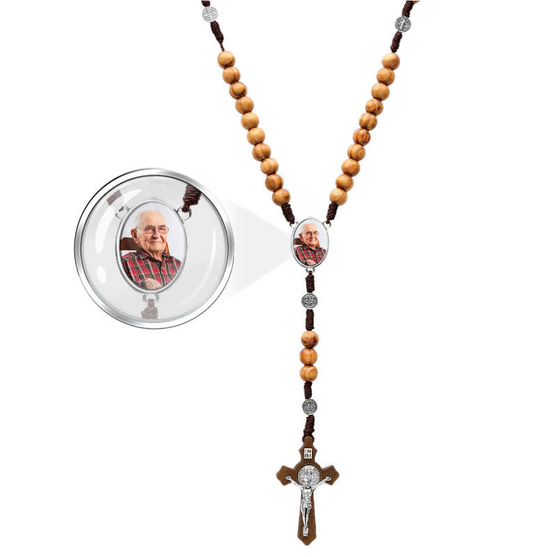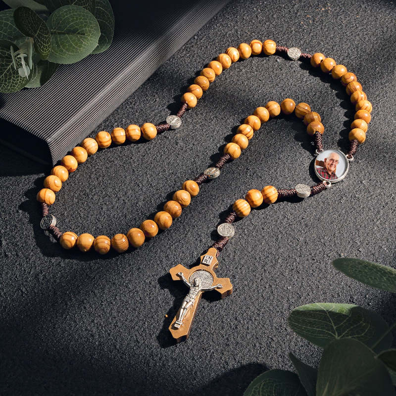 Sentimental Memorial Gifts for Prayers Custom Rosary Beads Cross Necklace Personalised Vintage Light Wood Beads Handwoven Necklace with Photo