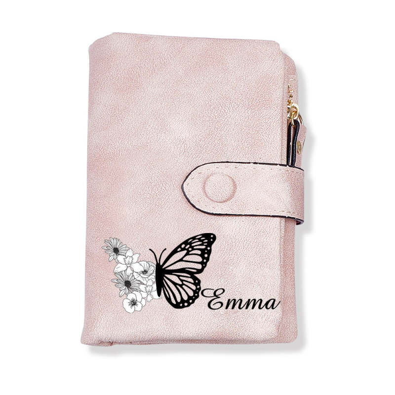 Custom Tri-Fold Butterfly Birth Flower Leather Wallet with Coin Holder Personalised Mother's Day Gift for Woman