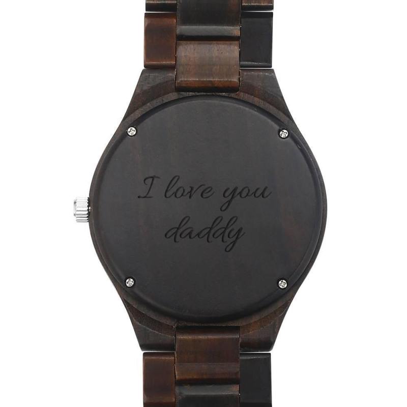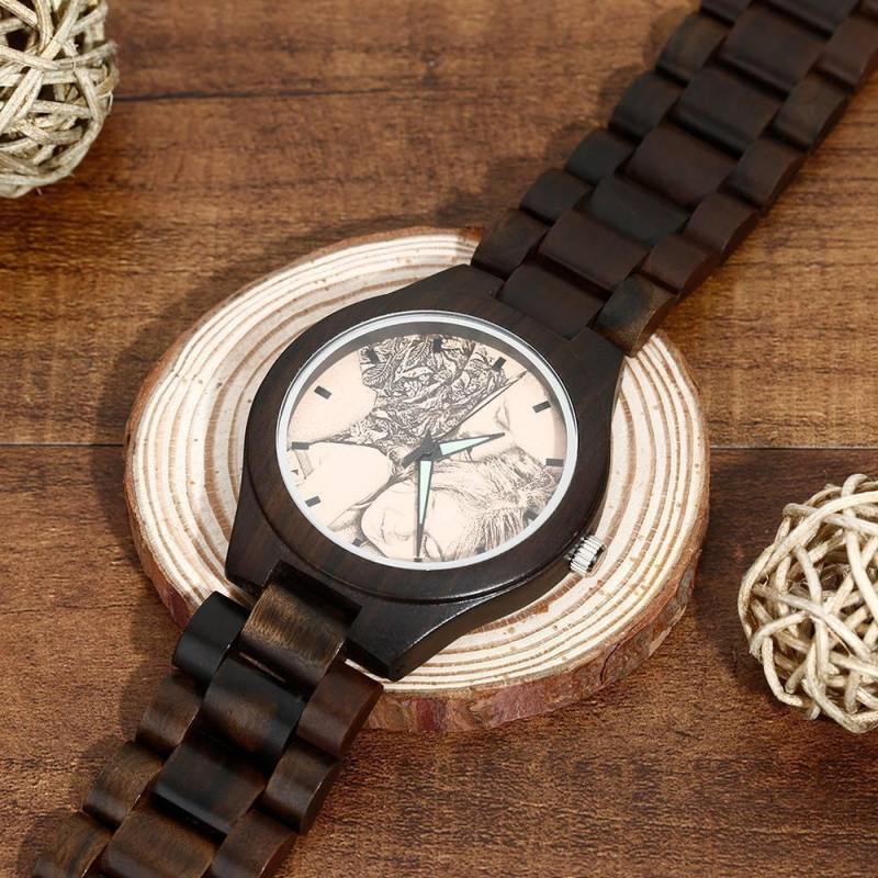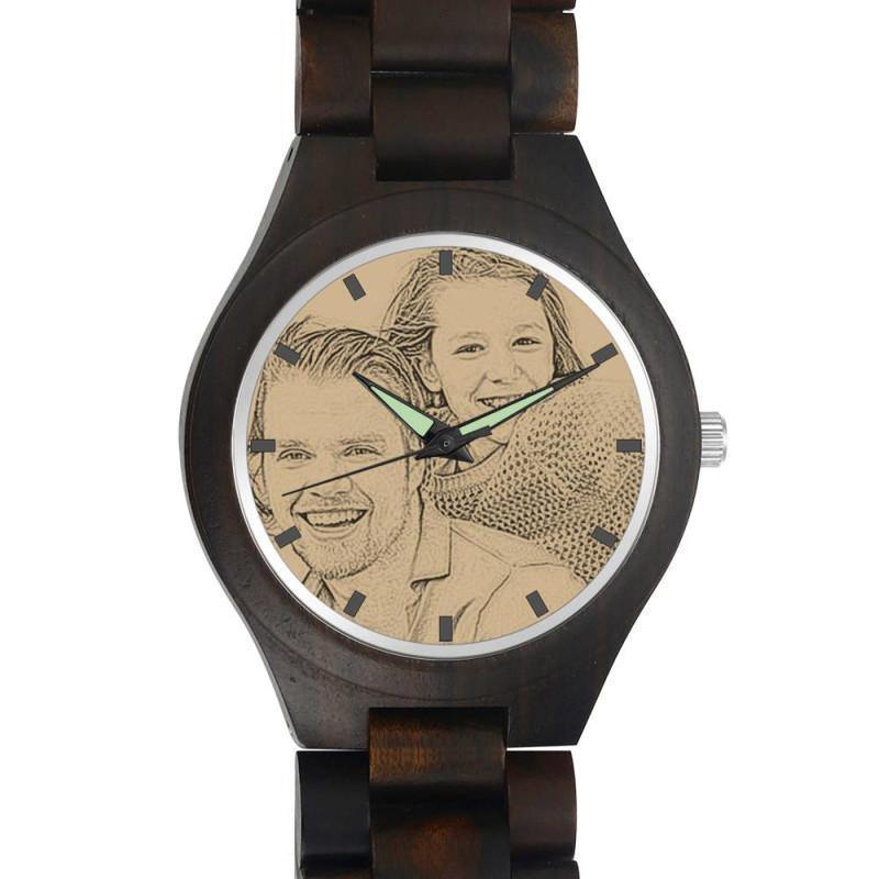 Men's Engraved Wooden Photo Watch All Black Ebony 45mm